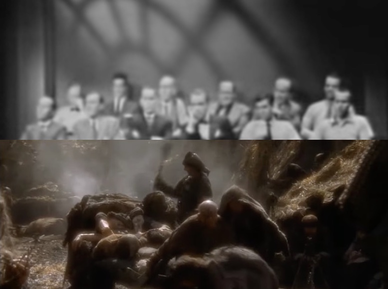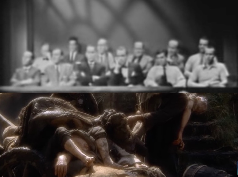 I juxtaposed stills from the film Monty Python and the Holy Grail (1975) with stills from a televised theatrical production of Twelve Angry Men (1954). I used the copyrighted images under fair play provisions for educational or commentary (& non-profit) purposes.